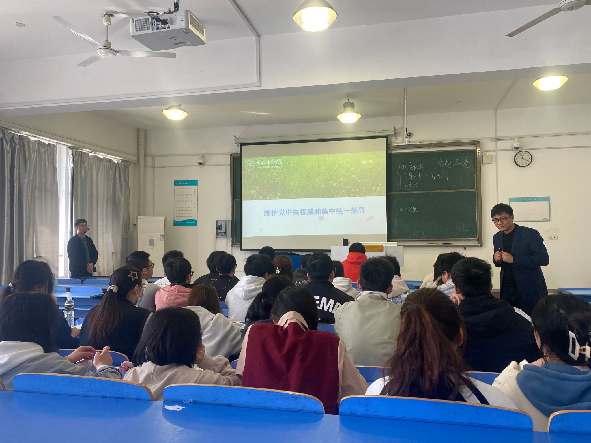 在逸夫楼A407教室,郝嘉乐老师用“请你谈谈,人民群众支持与拥护中国共产党的事例”导入,运用大量鲜活的学生身边事例、典型案例、红色故事,生动阐释“坚持党对一切工作的领导”重大意义,深入分析“党的领导是全面的、系统的、整体的”。紧接着,张军占又从理论、历史、现实三重逻辑全面分析“维护党中央权威和集中统一领导”是历史和人民的选择,是提高国家治理科学决策的最有效原则。同时引导青年大学生爱党爱国,自觉地拥护“两个确立”、做到“两个维护”。