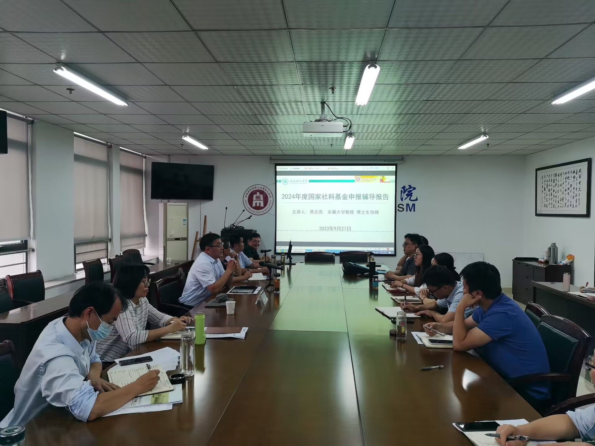 黄志高从自身课题申报的经验出发,围绕课题类型、确定选题和课题论证三个方面做了详细的阐述。他介绍了安徽省社会科学创新发展研究、安徽省社科基金、教育部项目、国家社科等课题类型;强调了选题的至关重要性,并指出“好的选题是成功的一半”;同时剖析了课题论证的总体要求,就申报书的选题依据、研究内容、创新之处、预期成果、研究基础等部分的撰写要点和注意事项,给出了有建设性的意见和建议。讲座结束后,学院教师充分利用这次讲座的机会,针对具体的申报书写作规范与黄志高进行了互动交流。