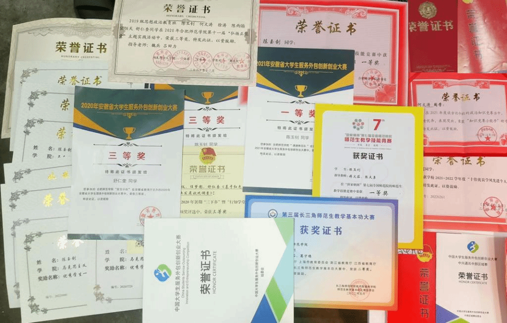 在校期间这4位同学表现优秀,践行“爱满天下、知行合一”的校训,积极拓展自己的课外实践能力,积极参加各类比赛,不断提升自己的综合素质。陈玉钊获得省、国级奖8项,其中包括“田家炳杯”全国师范院校师范生教学技能竞赛全国一等奖,安徽省大学生服务外包创新创业大赛一等奖,校级“十佳优良学风先进个人”、“三好学生”、“优秀学生干部”等荣誉。何文涛参加的大学生创新创业训练项目获国家级立项,获得校三等奖学金,同时也是全国大学生才艺锦标赛一等奖获得者等。舒仁奎获得安徽省服务外包创新创业大赛三等奖、中国大学生服务外包创新创业大赛中部赛区三等奖、第六届“互联网+”创新创业大赛校级二等奖、暑期“三下乡”实践活动三等奖等。陈雨旸获得剧本大赛校级二等奖、师范生技能大赛院级二等奖、“党史宣传月”宣传活动先进个人、暑期“三下乡”优秀志愿者、疫情防控义务宣传活动优秀志愿者等。四人相互勉励,共同组队参与比赛,合作获得安徽省百所高校百万大学生科普创意创新大赛校级二等奖。这些奖项见证了他们的大学四年,是他们大学时光的一个缩影。