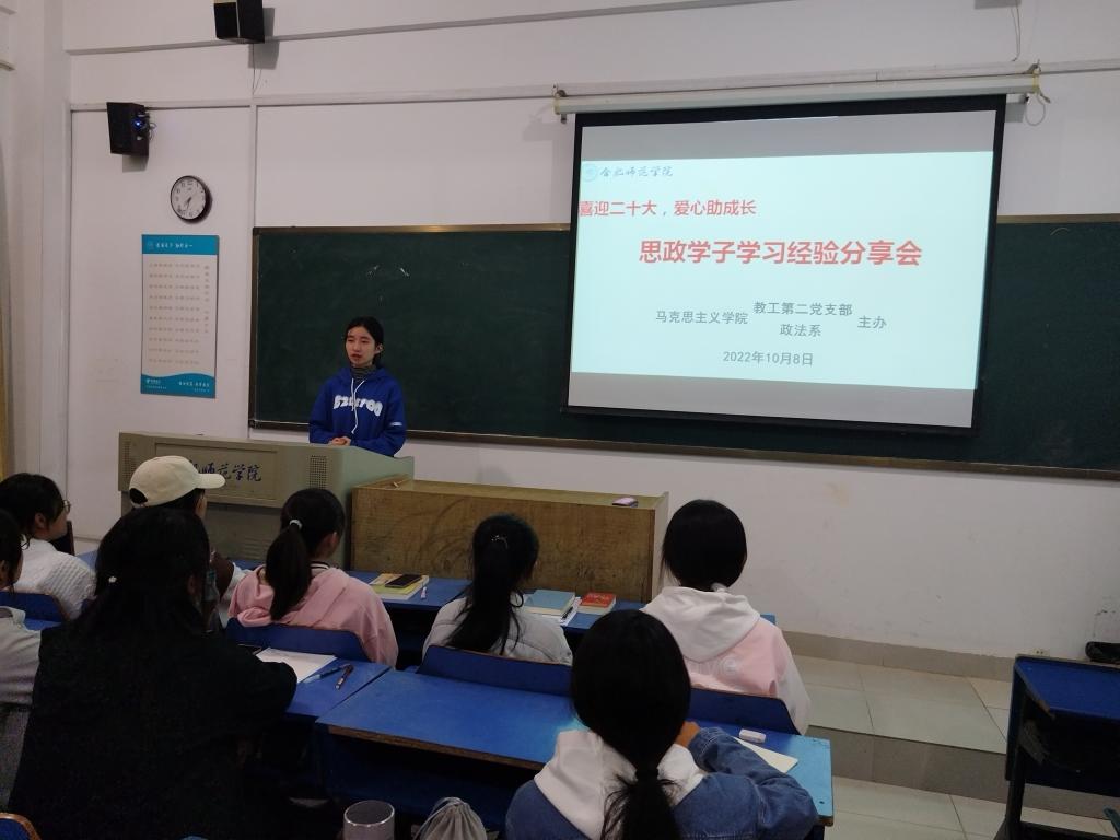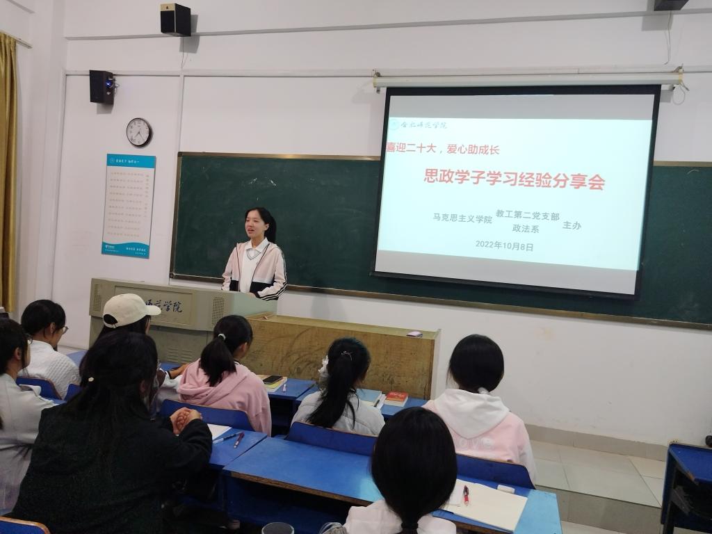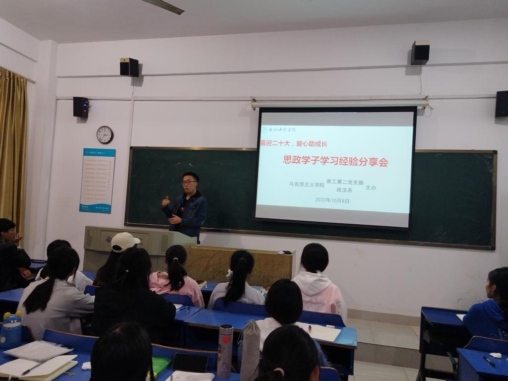 本网讯 为帮助2022级思想政治教育专业新生进一步了解大学学习的特点,尽快适应大学生活,10月8日晚,以“喜迎二十大,爱心助成长”为主题的新生适应性系列活动,在锦绣校区博约楼104教室举办。首次活动包括“思政学子学习经验分享会”和“大学学习方法微讲座”。2022级全体新生参加,活动由beat365官方网站教工第二党支部与政法系联合主办。