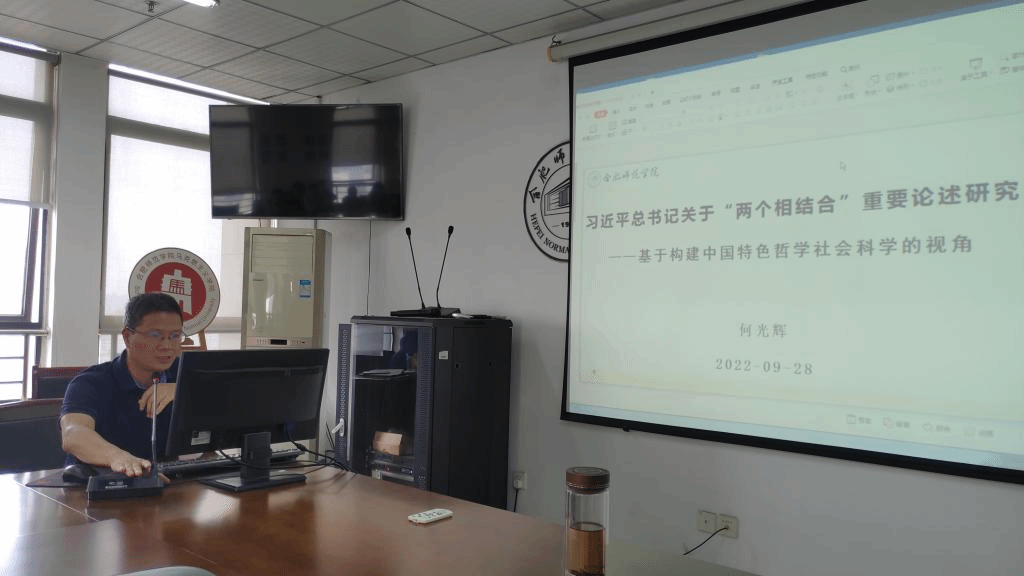 本网讯 beat365官方网站于9月28日下午在院会议室举行了本学期第一次学术交流会,会议由陶有浩副院长主持,何光辉教授作题为“习近平关于“两个相结合”重要论述研究——基于构建中国特色哲学社会科学的视角”的报告。