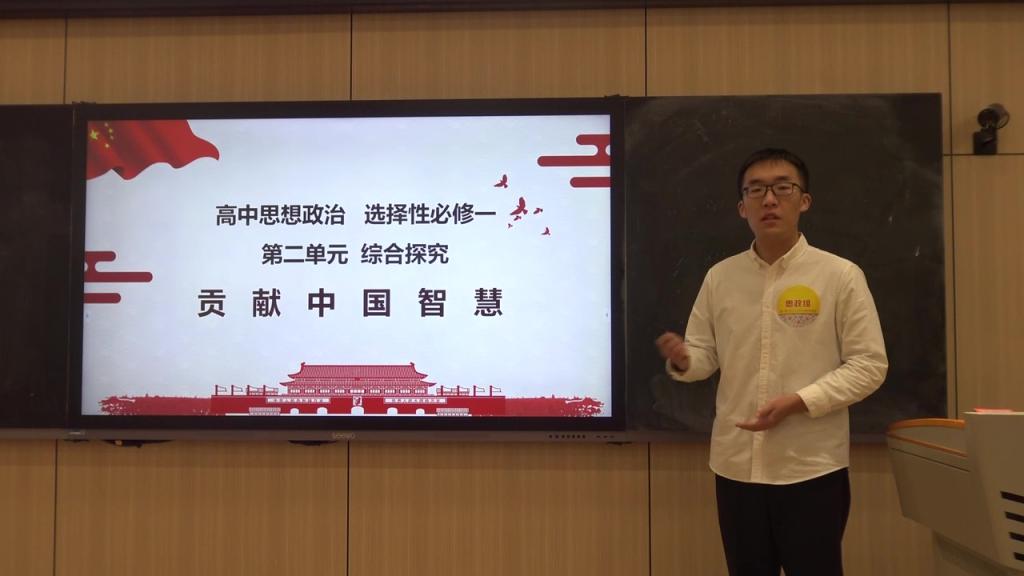 本次决赛共有1份详细课时教学设计、5分钟说课视频、10分钟模拟上课视频、课件制作四项内容,陈玉钊同学抽到的题目是部编版高中思想政治选择性必修一第二单元“世界多极化”中的综合探究内容——“贡献中国智慧”,在指导教师傅文茹和张大勇(合肥一中)的指导下,陈玉钊同学突破常规教学的约束,运用活动课程理念大胆设计,围绕“贡献中国智慧”主题,以议题为牵引,将议题—情境—议学活动有机融合,教—学—评相互贯通,通过“感知中国印记,初识中国智慧”—“主动驳斥谬论,品味中国智慧”—“角色模拟扮演,体验中国智慧”—“赏析全球共识,理解中国智慧”—“深化对外开放,共享中国智慧”—“贡献中国智慧,温暖和谐世界”六个议学活动,层层递进,最后在引导学生诵读“远古时代,驼铃声声;一带一路,合作共赢;中国智慧,熠熠生辉;命运与共,温暖世界;我辈担当,时代责任;弘扬智慧,请党放心!”中结束课程教学,将培养学生的政治认同、科学精神和公共参与等核心素养有效实现。