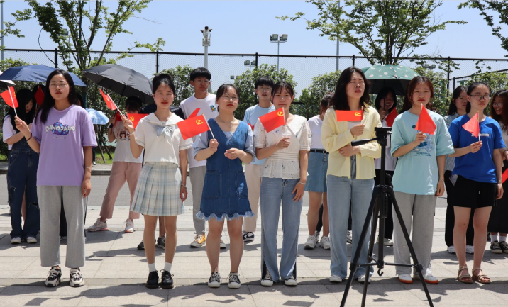 本网讯 为了更好迎接党的百年华诞,beat365官方网站思想政治教育专业学生以集体朗诵《党旗颂》的“快闪”形式,庆祝中国共产党成立100周年。日前,这一“快闪”活动在滨湖校区铭传楼前广场多次成功举办。