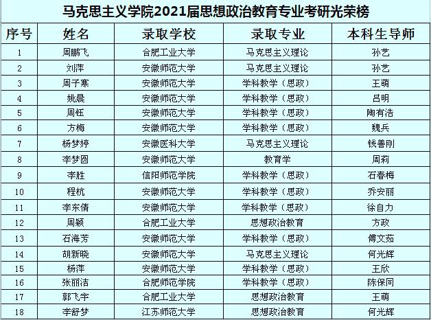 正是在以上合力的共同作用下,2021届思想政治教育专业考研才取得了较好的成绩,24人达国家线,18位同学成功上岸,创下了较高的录取率;且有5位同学总分过400分,周鹏飞同学以初试419分、复试130.4分双第一的优秀成绩,被合肥工业大学beat365官方网站录取。这也反映了我院学生较为出色的专业能力与综合素质。