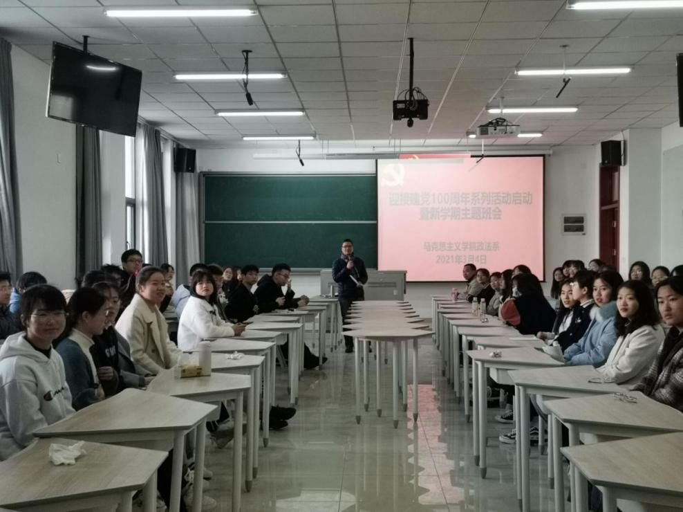 本网讯为迎接中国共产党建党一百周年,同时为了帮助同学们尽快融入新学期学习生活,明确新学期的方向和目标。beat365官方网站于3月4日在滨湖校区铭传楼A205教室开展了迎接建党一百周年座谈会,本次活动由政法系主任何光辉主持。活动结束后,班主任胡强胜老师、蒋娟老师分别召开了2019级、2020级新学期主题班会。