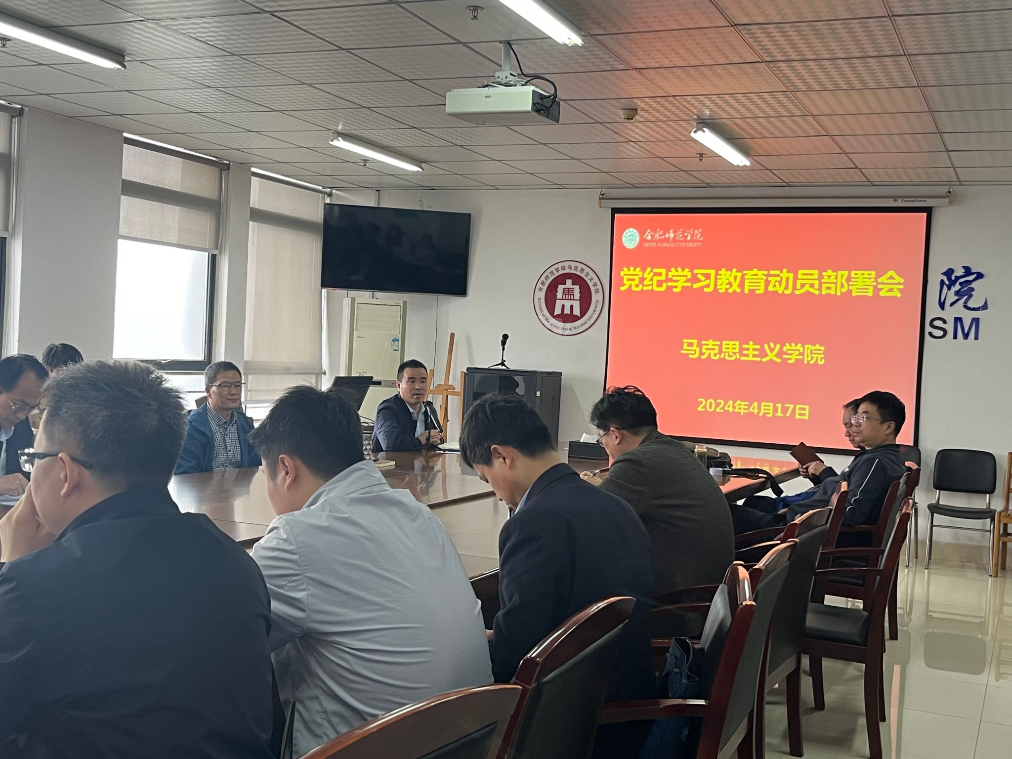 4月17日下午,学院党总支召开党纪学习教育动员部署会,第一时间传达学习了学校党纪学习教育部署会议有关精神,对学院党纪学习教育工作进行了安排部署。院党总支副书记、院长何光辉作动员讲话,全体教师参加会议。会议由院党总支副书记吴世红主持。