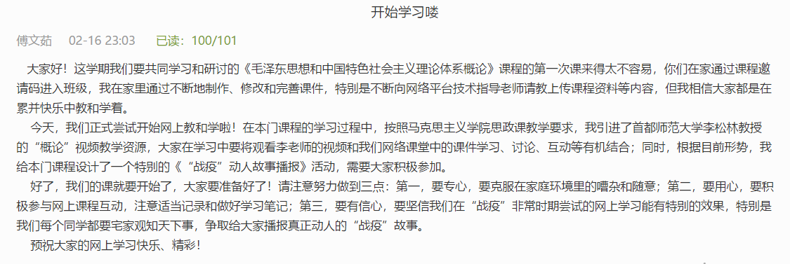 在网络教学开始之时,老师们都很紧张。因为以前并没有制作过相关微课的经验,很苦恼如何在储备不足又急需要开课的情况下使网络教学有效实施。非常感动的是特殊时期“学习通”“中国大学MOOC”等相关网络教学平台给老师们提供了许多教学资源。经过教研室老师们的共同研讨,大家统一在《毛泽东思想和中国特色社会主义理论体系概论》课程教学中,使用首都师范大学李松林老师的教学微课视频。我很快在平台技术老师的帮助下,收藏了李老师的微课视频,但如何导入我的课程,特别是相对应的章节,我又遇到了难题,教研室技术较好的小静老师将具体操作拍成视频发给我,并且一步步指导,帮助我很快完成了“概论”课学生必看微课视频的准备工作。但在备课中我又想到学生上课不能仅仅观看视频,于是我在认真钻研教材和学习李老师的视频后,根据课程内容给学生补充了相关拓展延伸的阅读材料,并每周给学生推荐一篇与形势密切结合的美文(目前已推荐学生阅读的文章有:《卢黎歌:以积极健康心态应对疫情防控阻击战》、《徐文秀:疫情中的“中国样子”》、《王文:2020年,中国必须打赢这五场战役!》),以确保课程教学内容的正确和正能量。