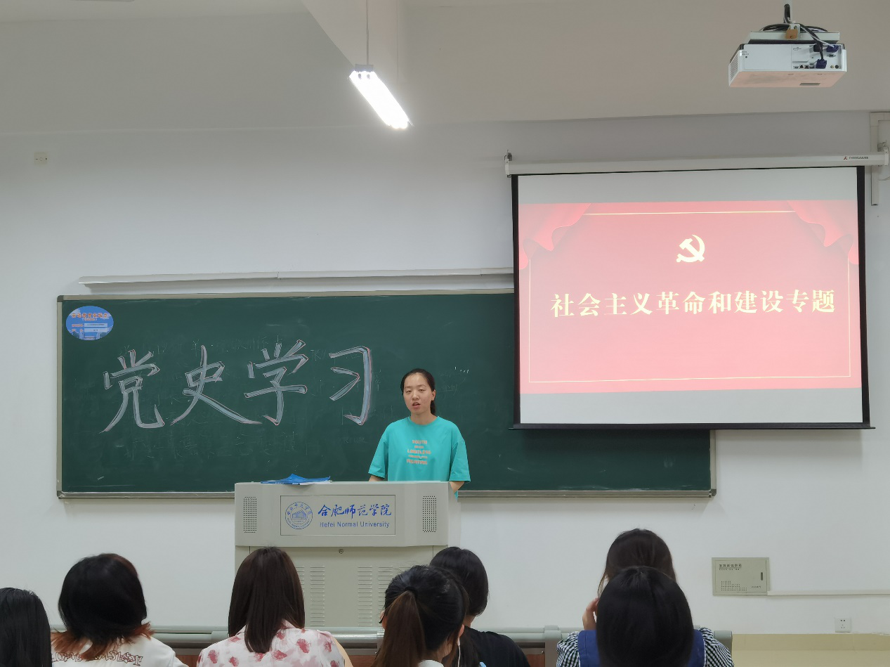 20级思想政治教育班团支部为本次党史宣讲活动做了充分准备,20级团支书高文杰为大家进行本次党史宣讲,内容主要是社会主义革命和建设时期中国共产党的发展历程。从新民主主义向社会主义过渡到完成社会主义改造,建立社会主义制度以及我们国家在社会主义建设探索中的曲折前进和伟大的改革开放,讲述了中国共产党人在建设中取得的巨大贡献和形成的伟大精神。以历史中的伟大转折改革开放为重点,弘扬党的伟大精神中的锐意改革创新,在新时代的起点上继续推进改革开放,为实现“两个一百年”奋斗目标而努力。讲述完毕后,高文杰播放了一段有关社会主义革命和建设的纪录片,带领大家深入了解社会主义革命和建设的发展历史,让同学们进一步了解中国共产党人在该时期发挥的重要作用。