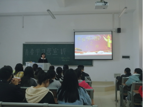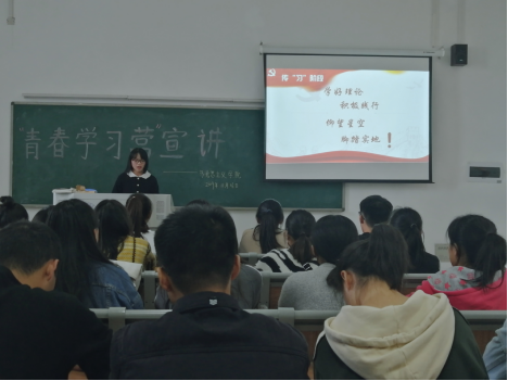 李胜同学在宣讲中说,青春学习营是校党委推动提升全院青年学生思想政治素质,着力培养德智体美劳全面发展的社会主义建设者和接班人、着力培养担当民族复兴大任的时代新人的重要举措,是推动广大青年大学生学习新思想、宣传新思想、践行新思想的重要举措。她向同学们介绍了青春学习营的学习分为三个阶段:开展学习沙龙活动的学“习”阶段;开展主题演讲和征文比赛的讲“习”阶段;以及通过自学,将理论知识用于实践,以实际行动感染身边人的传“习”阶段。