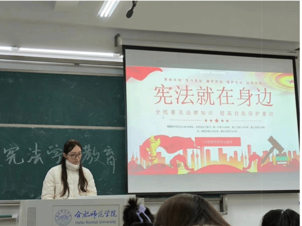 12月5日,学院开展“宪法就在我身边”主题班会,组织同学们深入学习贯彻习近平新时代中国特色社会主义思想特别是习近平法治思想,认真学习宪法的主要内容,引导学生树立宪法法律至上的法治理念,坚定不移走中国特色社会主义法治道路。2022级思想政治教育班芦建伟发表学习感悟,他深刻认识到习近平法治思想是新时代推进全面依法治国的根本遵循和行动指南。2023级思想政治教育班赵若情从宪法的起源讲起,从宪法的内容、宪法实施的意义和大学生如何利用宪法维护自身权益等方面阐述宪法相关知识,号召同学们了解宪法知识,维护宪法权威,增强法治意识。