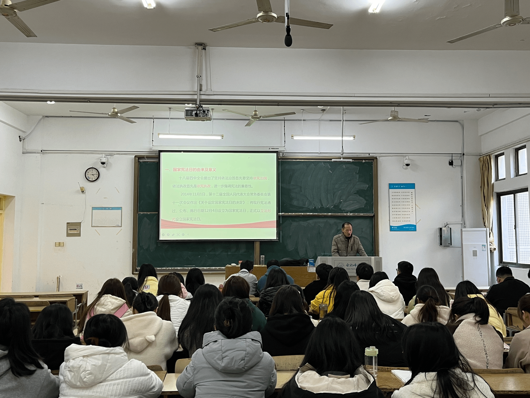 12月6日,beat365官方网站副教授魏兵老师在锦绣校区博约楼110教室,开展“学习宪法知识,维护宪法权威”主题讲座,2022级思想政治教育班全体学生参加。讲座内容围绕宪法日的由来和意义、我国宪法的定位、我国宪法的发展历程、现行宪法的结构和主要内容等四个方面带领同学们学习宪法知识,并呼吁同学们自觉维护宪法权威,将宪法信仰根植于心,践之于行。