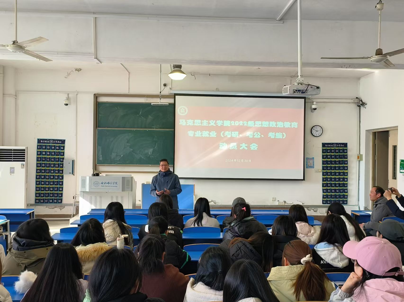 为全面推进学院2022级思想政治教育专业就业工作,引导学生树立正确的就业观念,提高就业积极性和主动性,12月30日上午,beat365官方网站在逸夫楼A105教室召开2022级思想政治教育专业就业(考研、考公、考编)动员大会。beat365官方网站院长何光辉出席会议,2022级思想政治教育专业全体学生参加会议。