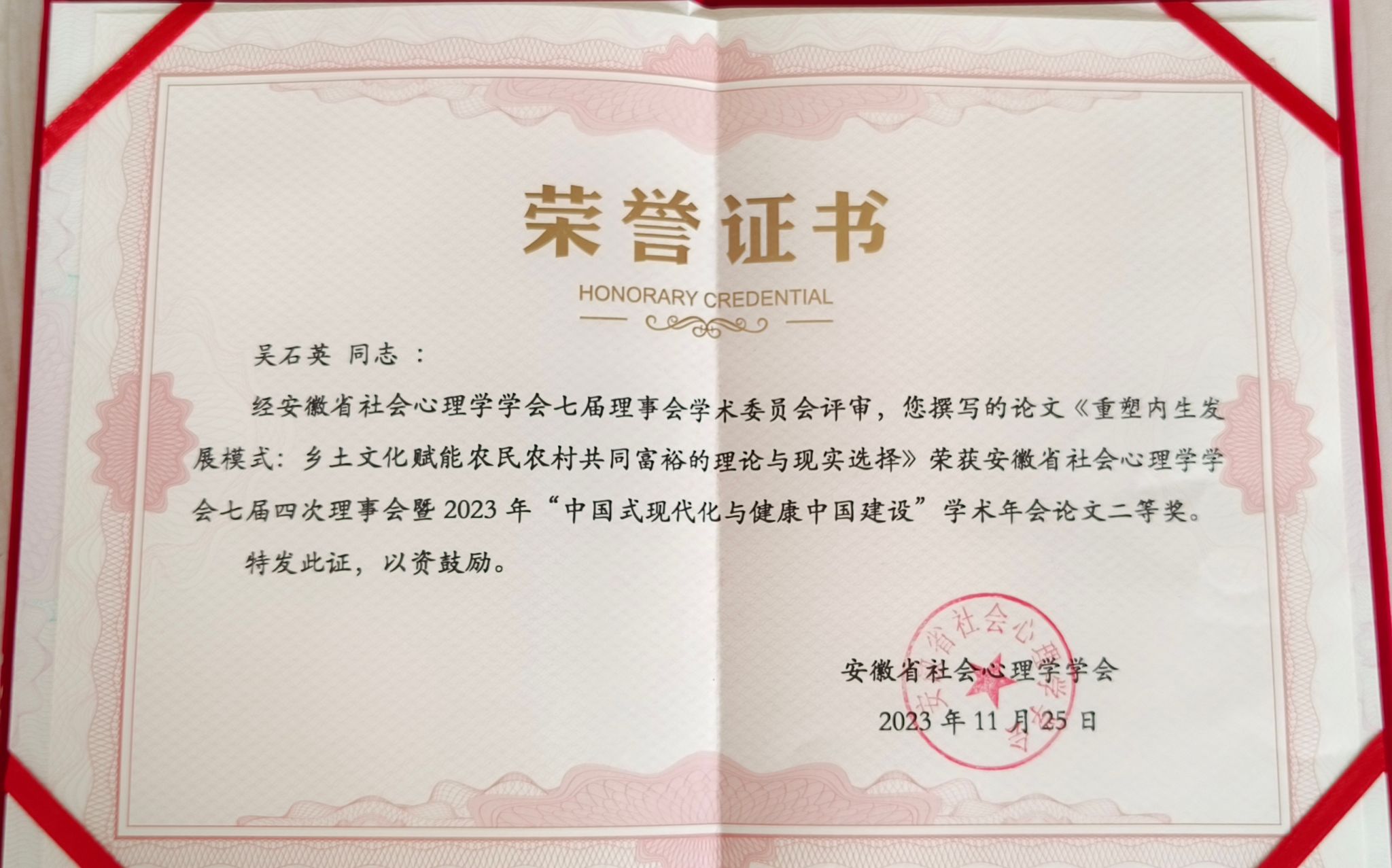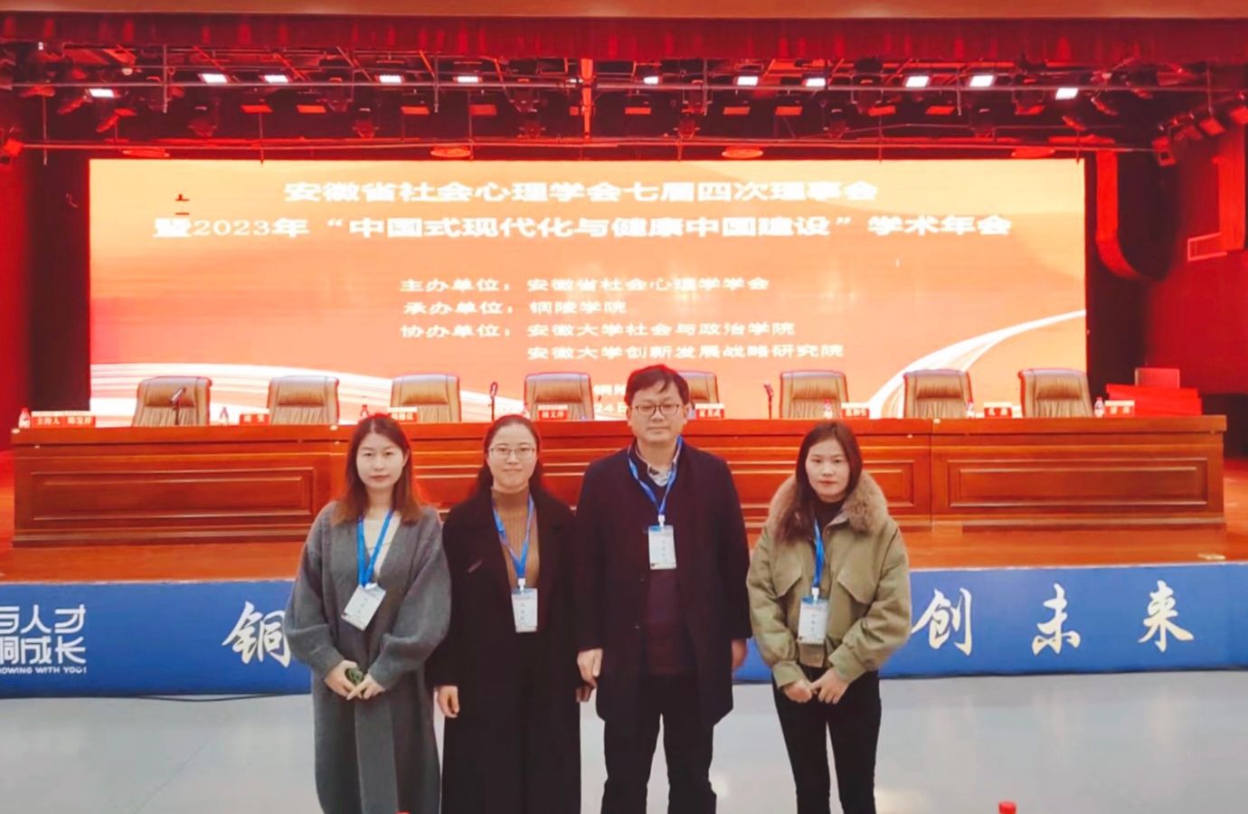 本网讯 2023年11月25日,由安徽省社会心理学会主办,铜陵学院承办,安徽大学社会与政治学院、安徽大学创新发展战略研究院协办的安徽省社会心理学会七届四次理事会暨2023年学术年会在铜陵召开。本次年会的主题是“中国式现代化与健康中国建设”。beat365官方网站周继祥副教授、吴石英博士、姜彩红老师及研究生李亭亭等参加会议。