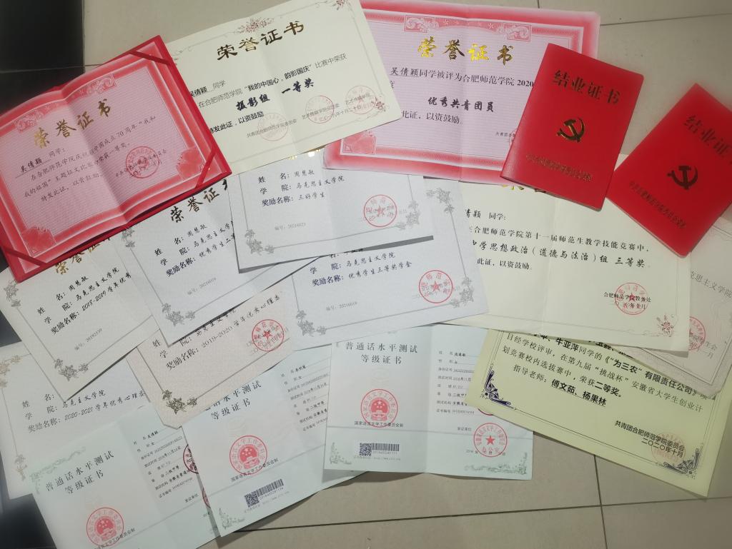 据了解,在校期间这四位同学也表现优秀,获得众多奖项。吴倩颖参加的大学生创业创新训练项目获国家级立项,同时也是优秀共青团员和心理委员,获得校二等奖学金和校征文比赛和摄影比赛一等奖。周慧敏获得过校二等奖学金和三等奖学金,校三好学生,以及优秀实习生荣誉。李明慧同学获得校三等奖学金和优秀共青团员。牛亚萍获得“挑战杯”安徽省大学生创业计划大赛二等奖,校三等奖学金。这些奖项固然不能充分证明这四位同学付出的全部努力,但从中也可以看出这四位女同学在学习和生活中的认真刻苦。