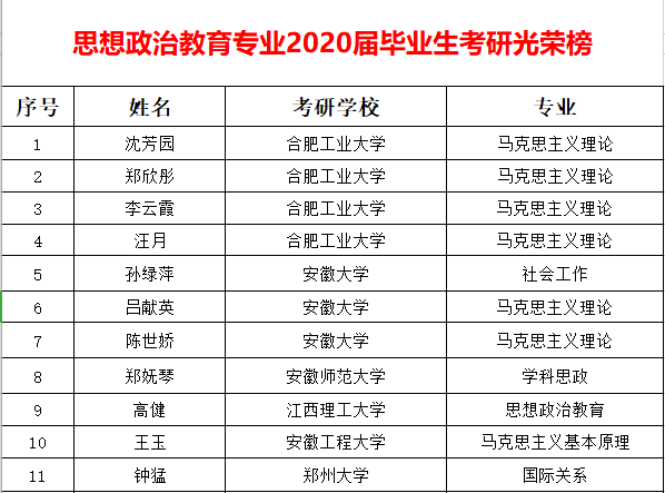 学生管理 当前位置: 主页 >> 备份资料 >> 学生管理 >> 正文 思想政治教育专业2020届毕业生考研光荣榜 发布日期:2020-11-30 编辑:beat365官方网站 核稿: 终审:刘艳 点击: