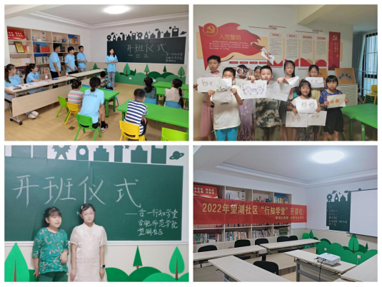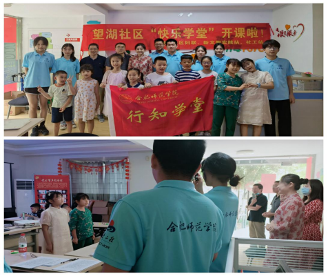 本网讯 继承行知精神,弘扬行知文化。7月7日上午,beat365官方网站“合一”行知学堂在合肥市包河区望湖社区顺利开班。来自beat365官方网站,艺术传媒学院,教师教育学院等学院的7名小先生与小学员们在合肥市望湖社区滨湖春天党群服务站举行了开班仪式。